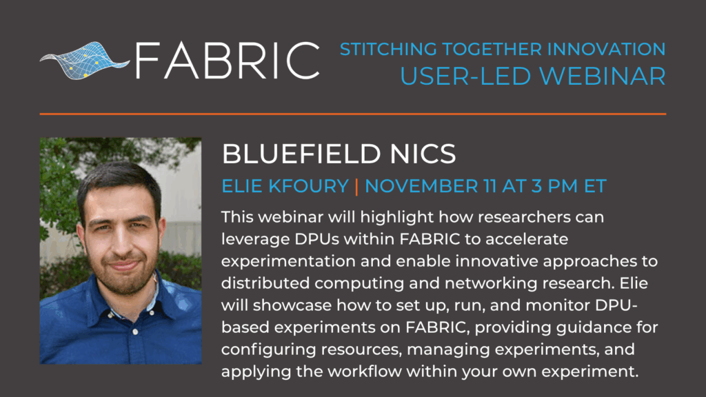 Join us on November 11, 2025, from 3:00–4:00 PM ET for the next session in the Stitching Together Innovation with FABRIC Users webinar series. This session will feature Elie Kfoury, who will lead a technical deep dive into Bluefield NICs Experimentation on FABRIC.