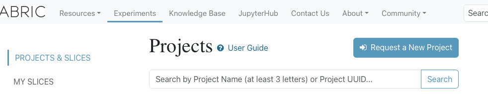 To request to be a Project Lead of a new project, navigate to the ‘Experiments’ tab in FABRIC menu, then from the ‘Projects & Slices’ menu click on the ‘Request a New Project’ button as shown in example image below: