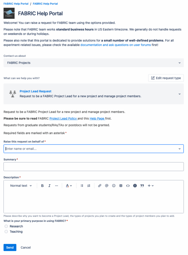 This will lead you to a Project Lead Request form in the FABRIC Help Portal. Please fill in the appropriate fields, especially paying attention to the email address you supply in the form – it must be the same email you used to sign up to the FABRIC Portal. If FABRIC Staff have any questions about your request you will receive them in the form of an email at the address you indicate in the form: