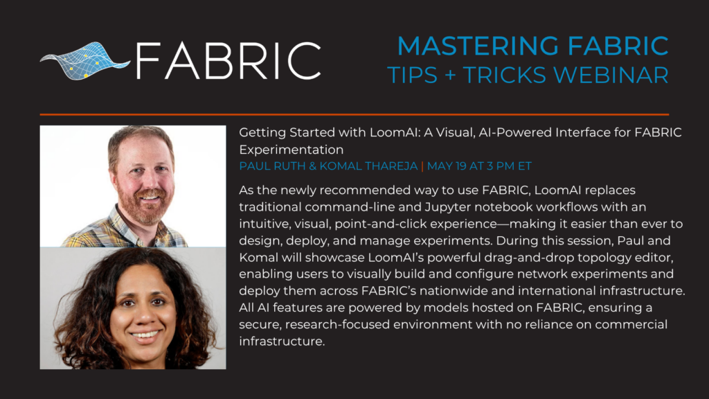 Join us on May 19, 2026, from 3:00–4:30 PM, for an engaging FABRIC Tips & Tricks webinar introducing LoomAI, a new open-source, browser-based interface that transforms how researchers interact with the FABRIC testbed. As the newly recommended way to use FABRIC, LoomAI replaces traditional command-line and Jupyter notebook workflows with an intuitive, visual, point-and-click experience—making it easier than ever to design, deploy, and manage experiments.