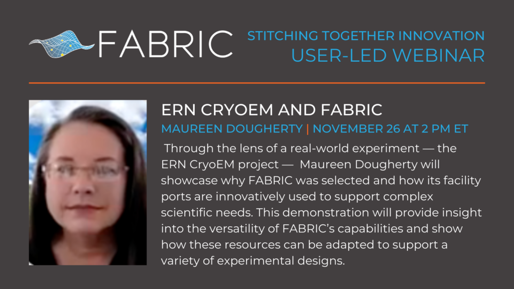 Explore how FABRIC’s unique network and computing resources can elevate your research during our webinar on “ERN CryoEM and FABRIC.” Through the lens of a real-world experiment — the ERN CryoEM project — Maureen Dougherty will showcase why FABRIC was selected and how its facility ports are innovatively used to support complex scientific needs. This demonstration will provide insight into the versatility of FABRIC’s capabilities and show how these resources can be adapted to support a variety of experimental designs.